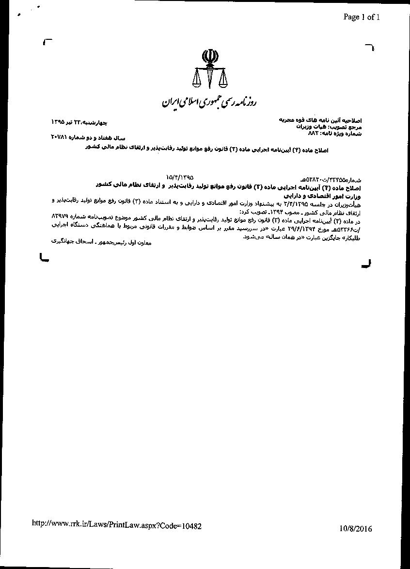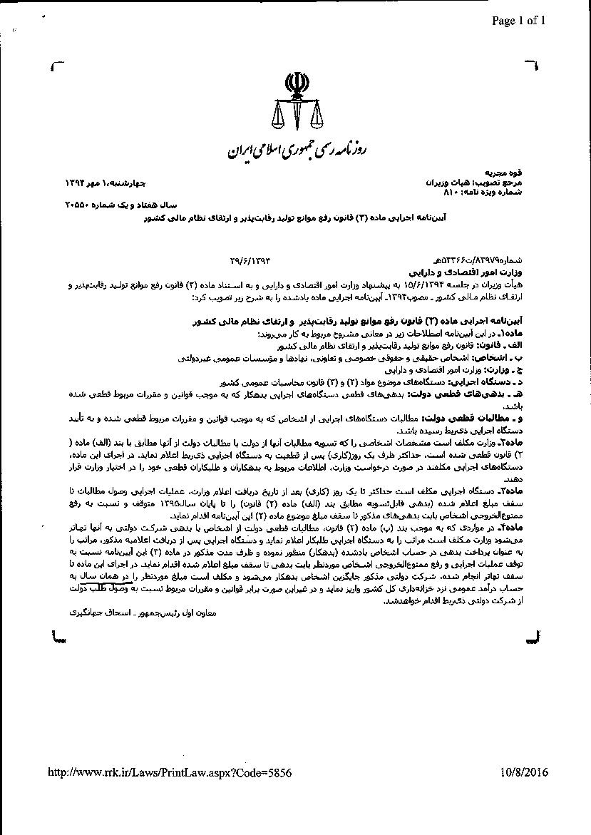 به پیوست آیین نامه اجرایی ماده (3) قانون رفع موانع تولید رقابت پذیر و ارتقای نظام مالی کشور مصوب 01/02/1394 موضوع تصویب نامه شماره 83979/ت52366 هـ مورخ 29/6/1394 و تصویب نامه شماره 43455/ت 52820 هـ مورخ 15/4/1395 هیات محترم وزیران موضوع اصلاح ماده (4) آیین­نامه اجرایی مذکور برای اطلاع و اقدام لازم ارسال می­گردد.