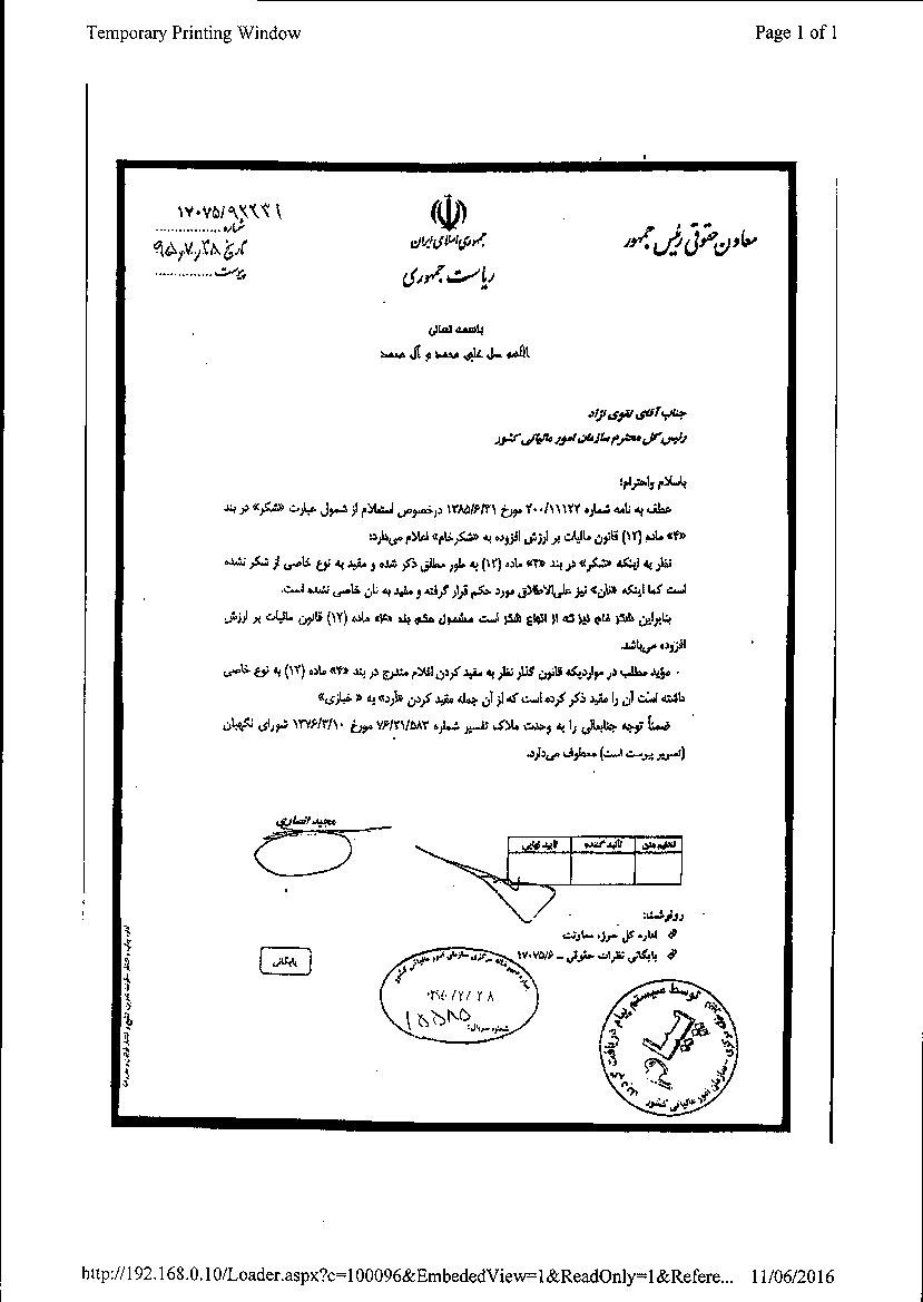 | به پیوست نظر معاونت حقوقی ریاست جمهوری به شماره 92231/17075 مورخ 28/07/1395 که مقررنموده: ” نظر به اینکه “شکر” در بند(4) ماده(12) به طور مطلق ذکرشده و مقید به نوع خاصی از شکر نشده است، کما این که “نان” نیز علی الاطلاق مورد حکم قرار گرفته و مقید به نان خاصی نشده است، بنابراین شکر خام نیز که از انواع شکر است مشمول بند(4) ماده(12) قانون مالیات بر ارزش افزوده میباشد.” جهت اطلاع و بهرهبرداری ارسال میگردد. سیدکامل تقوی نژاد رئیس کل سازمان امور مالیاتی کشور  | |||||