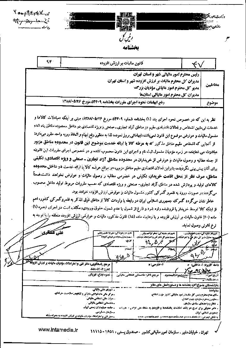 | پیرو بخشنامه شماره 47/94/200 مورخ 10/05/1394 موضوع رفع ابهام از چگونگی اجرای قانون مالیات بر ارزش افزوده در مناطق آزاد تجاری-صنعتی و ویژه اقتصادی، نظر به برخی سوالات مطرح شده مقرر میدارد: 1- به استناد مفاد ماده (13) قانون مالیات بر ارزش افزوده، صادرات کالا وخدمت از طریق مبادی خروجی رسمی(منجمله از مناطق مذکور) به خارج از کشور مشمول مالیات و عوارض ارزش افزوده نمیباشد و با رعایت مقررات موضوعه مالیات و عوارض پرداخت شده مسترد میگردد. 2- صرف نظر از مفاد بخشنامه صدرالاشاره، مالیات و عوارض پرداختی مودیان مشمول این نظام مالیاتی به عرضه کنندگان کالاها و ارائه دهندگان خدمات غیر معاف در مناطق یادشده، بابت خرید کالا وخدمت،در صورتیکه عرضه کنندگان کالا و ارائه دهندگان خدمات مذکور، نسبت به پرداخت آن به حسابهای تعیین شده توس سازمان امور مالیاتی کشور اقدام نموده باشند، با رعایت مقررات مربوط بعنوان اعتبار مالیاتی پرداختکنندگان محسوب خواهدشد. سید کامل تقوی نژاد رئیس کل سازمان امور مالیاتی کشور | ||||||||