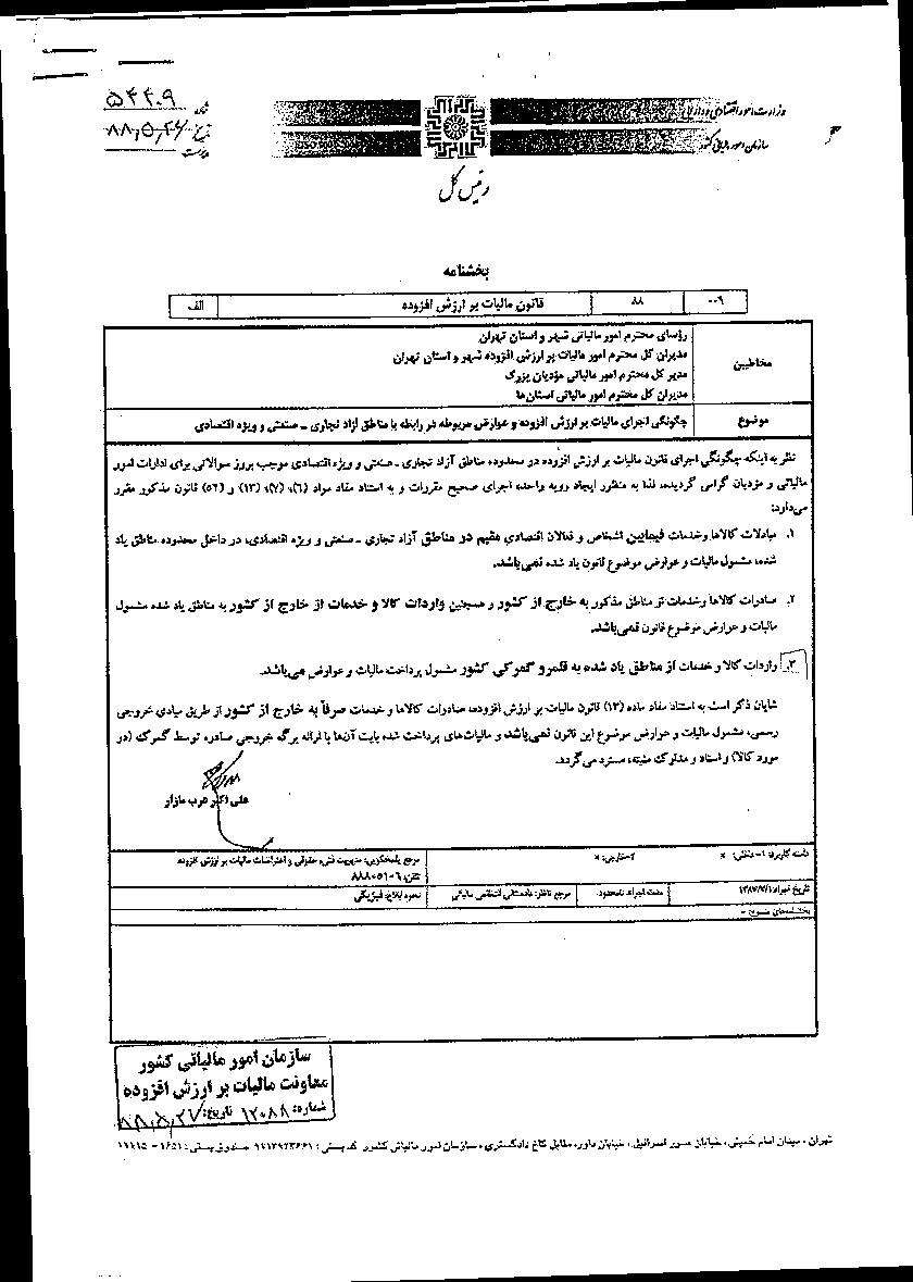 | پیرو بخشنامه 34283/230/د مورخ 1395/09/06 تصویر نامه 24665هـ/ب مورخ 1396/03/31 رئیس محترم مجلس شورای اسلامی عنوان ریاست محترم جمهوری اسلامی ایران مبنی بر ملغی الاثرشدن تصویبنامه شماره 74641/ت 53441هـ مورخ 1395/06/21 هیات محترم وزیران راجع به اجرایی دانستن مصوبه شماره 53970/ت52406 هـ مورخ 1395/05/10 از سه سال گذشته (از تاریخ تصویب مصوبه پیشین هیات وزیران به شماره 90836/ت 48793هـ مورخ 1392/04/18) به پیوست ارسال و یادآوری می نماید: با توجه به مراتب فوق، مصوبه شماره 74641/ت 53441هـ مورخ 1395/06/21 هیات محترم وزیران ملغی و تصویبنامه شماره 53970/ت52406 هـ مورخ 1395/05/10 بر اساس بند 3 آن از تاریخ تصویب (1395/04/30) لازم الاجرا می باشد. سید کامل تقوی نژاد رئیس کل سازمان امور مالیاتی کشور | ||||